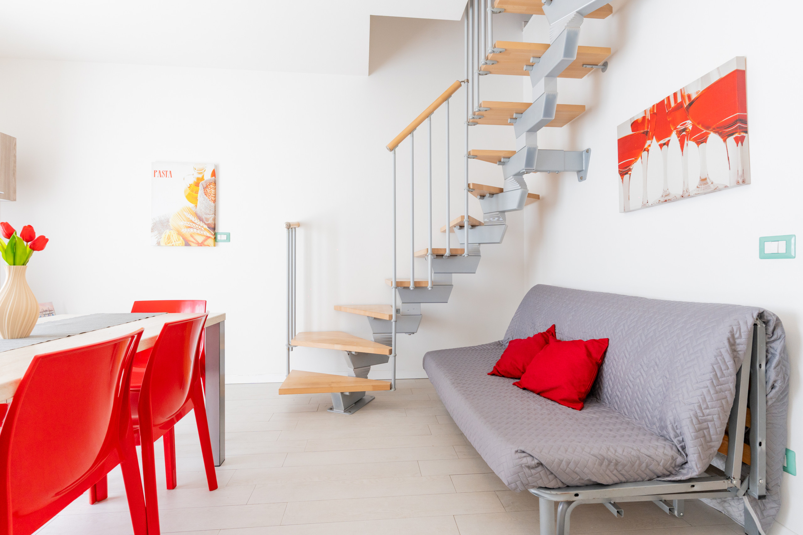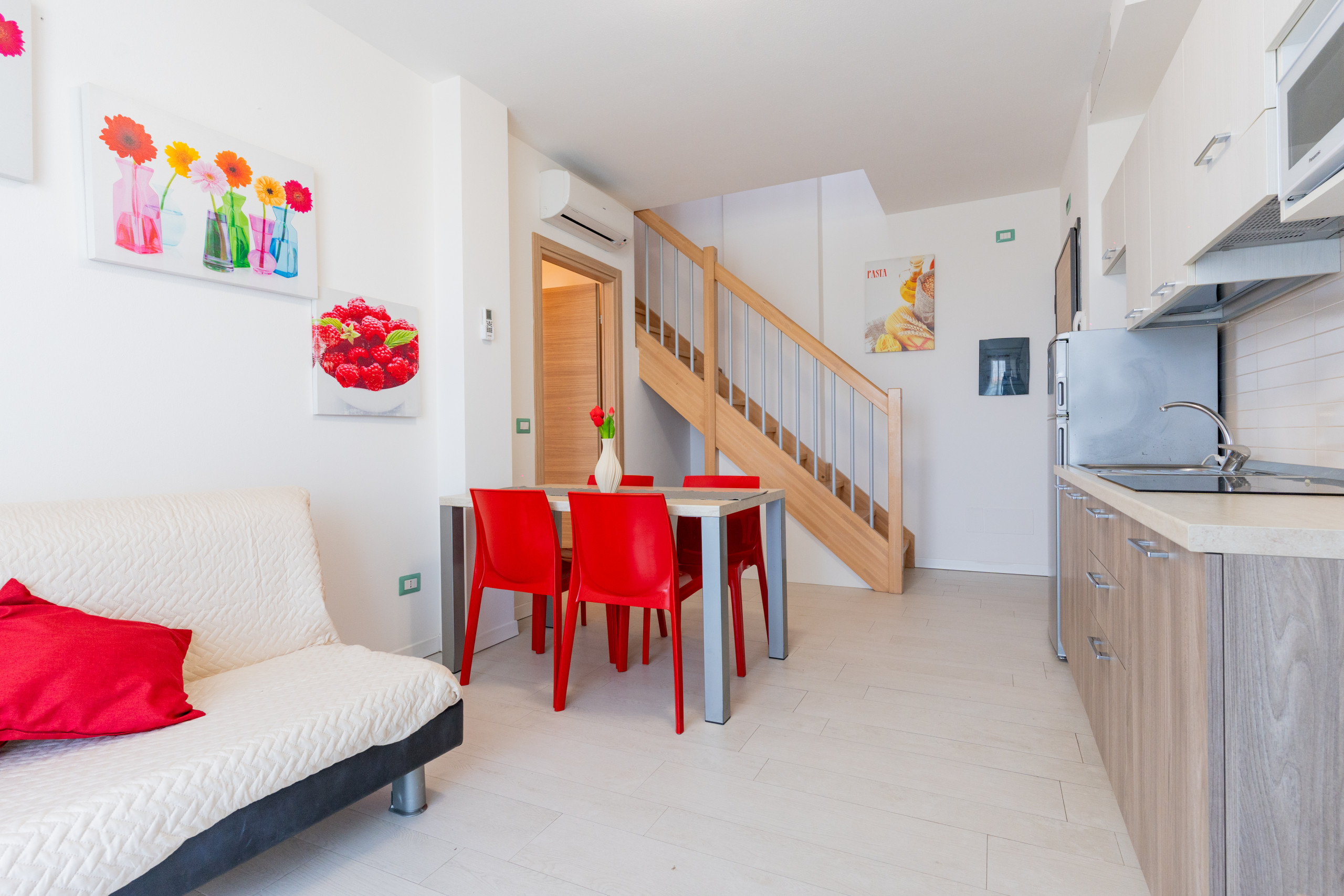 - cozy living room with equipped kitchenette, dining table with chairs, French double sofa bed, and direct access to the furnished balcony;