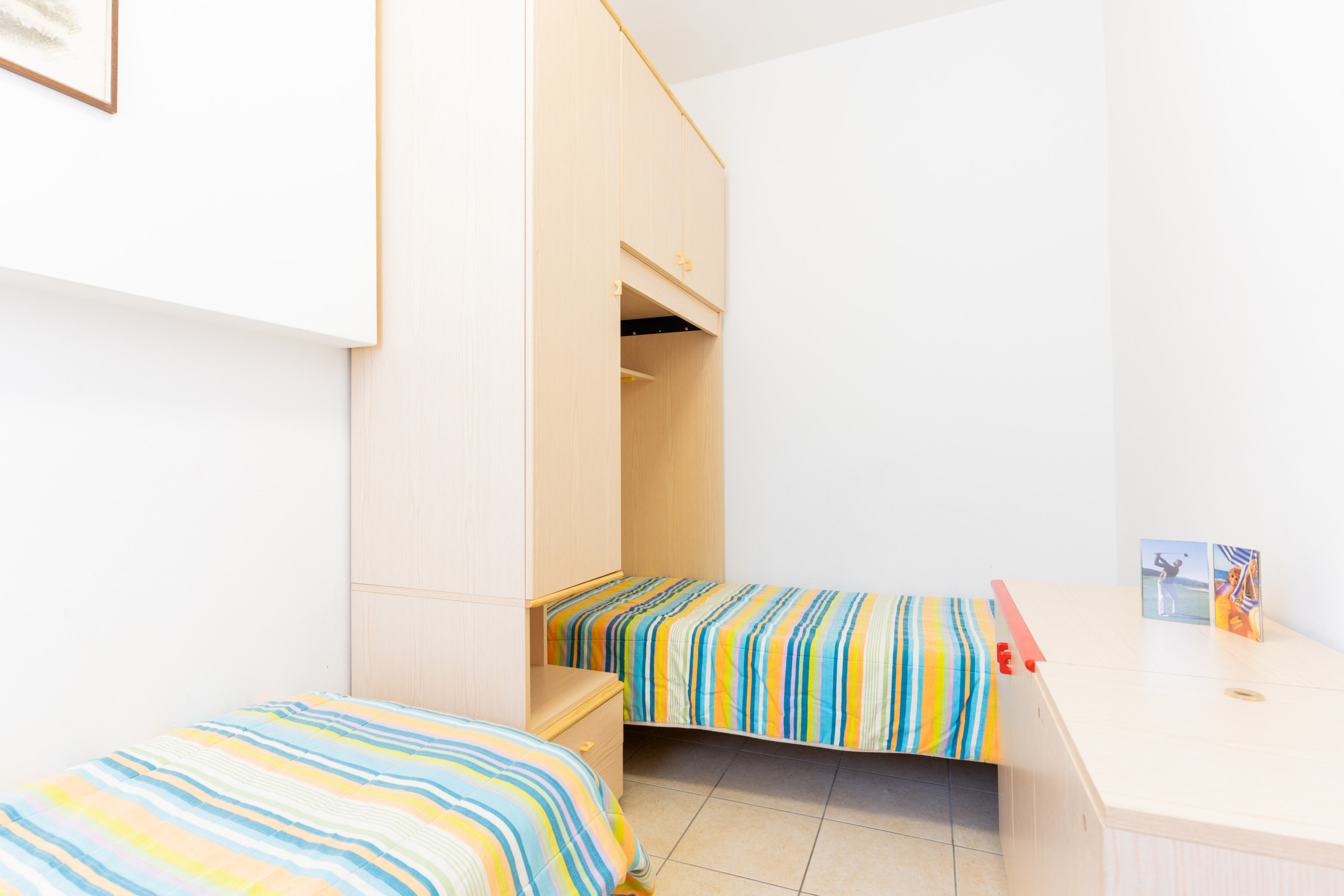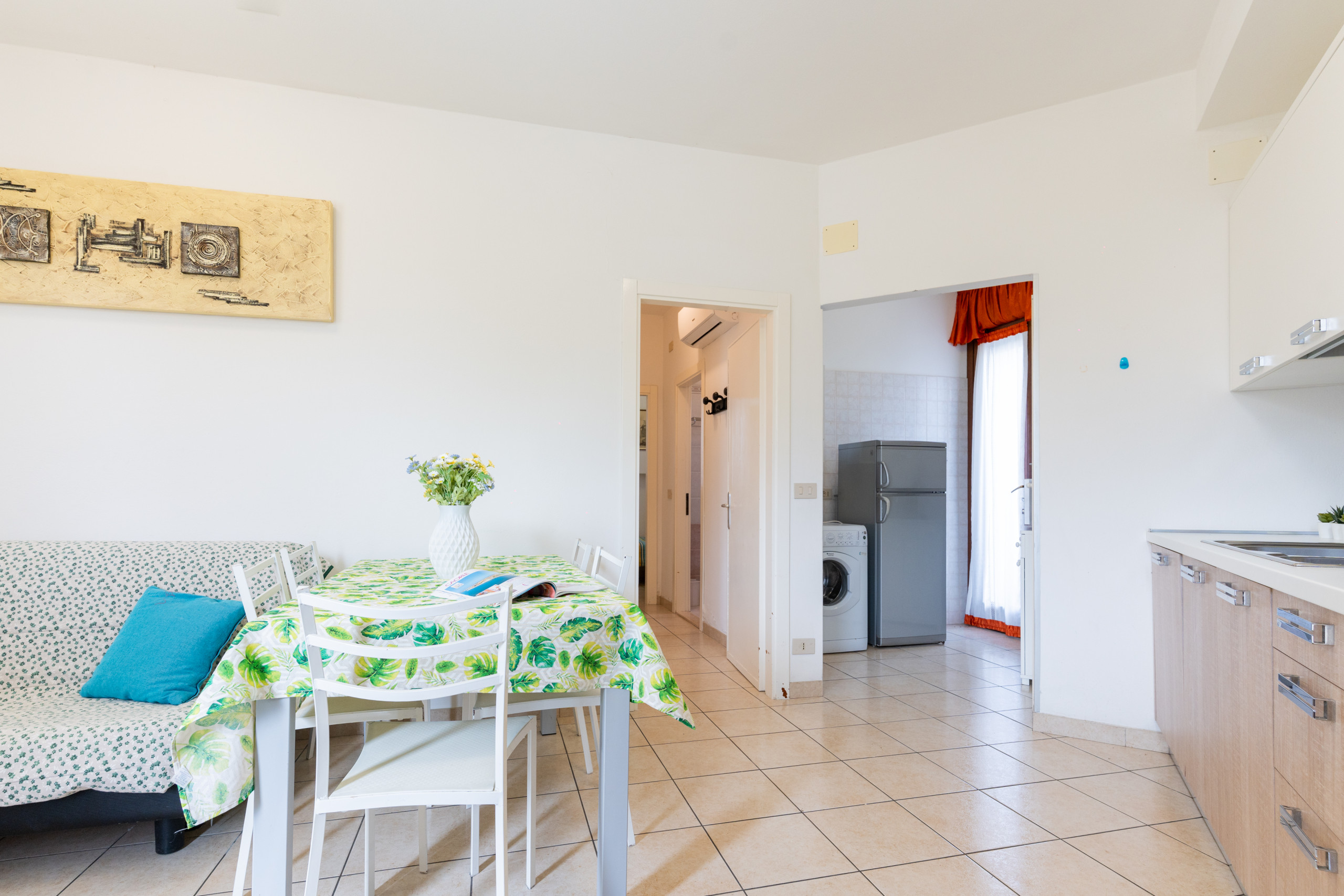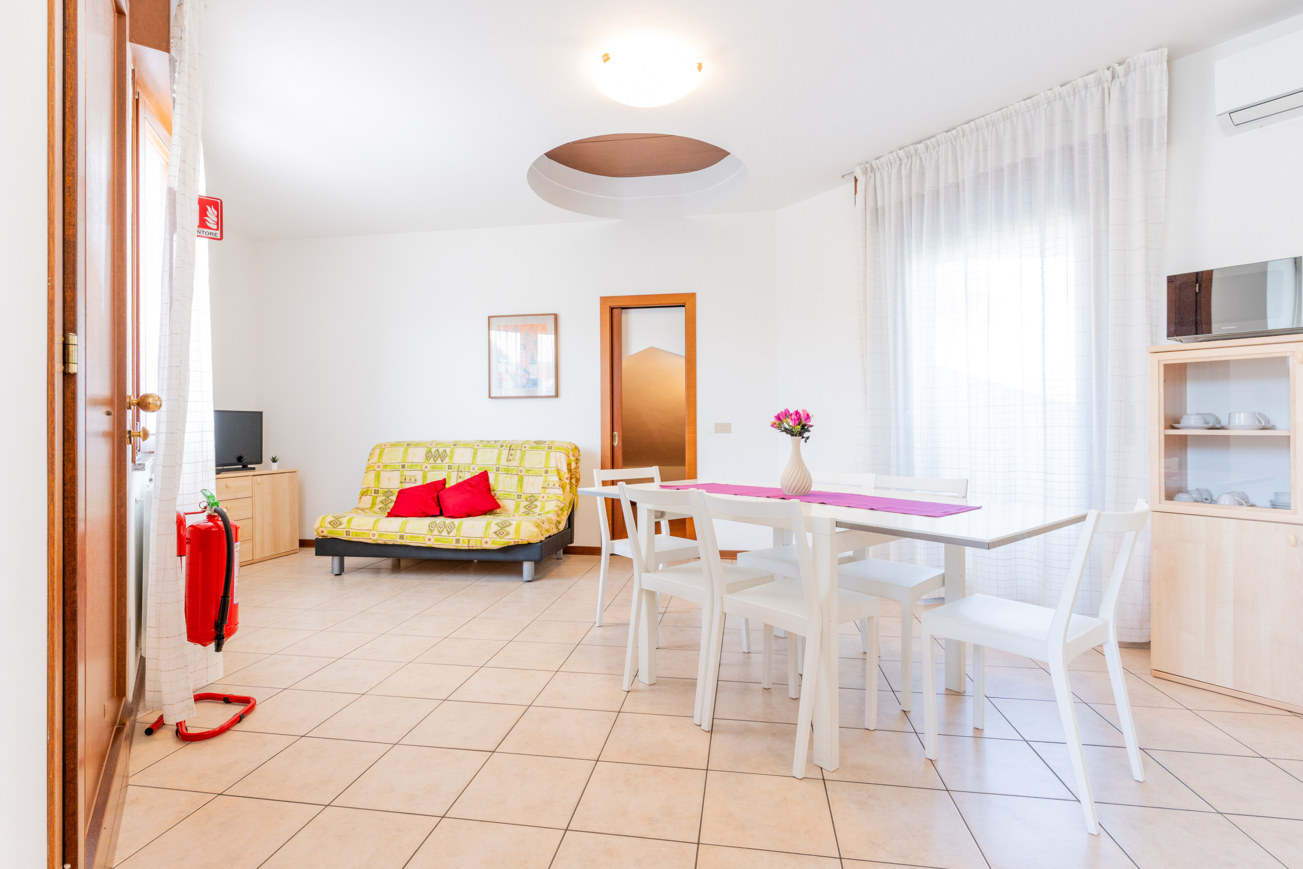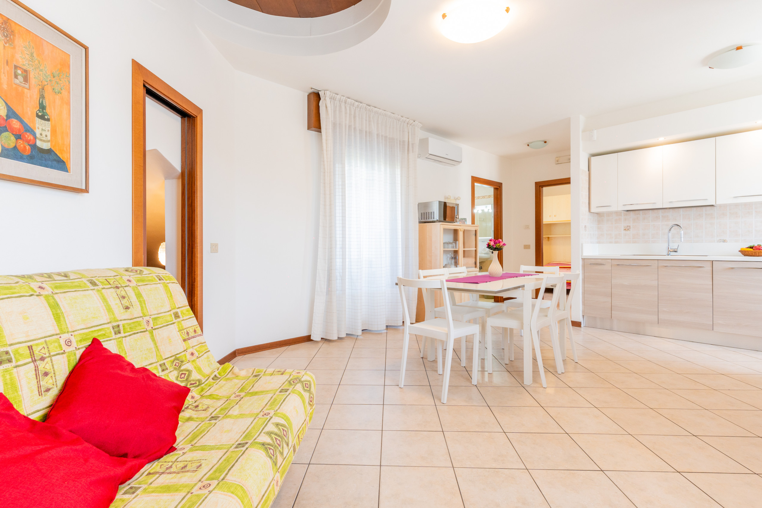 2 bedrooms flat on the first or second floor, Kitchenette and double sofa bed, balcony with table and chairs , 1 bathroom, bedroom with double bed, bedroom with 2 beds, TVSat, air conditioning, safe. Residence "I Tamerici" is a modern block of flats in Caorle Lido Altanea, developed on 3 and 4 floors facing a large swimming pool surrounded by sun beds. Available one and two bedrooms flats. Fee-paying beach service available (information in Lampo office in Caorle Lido Altanea).