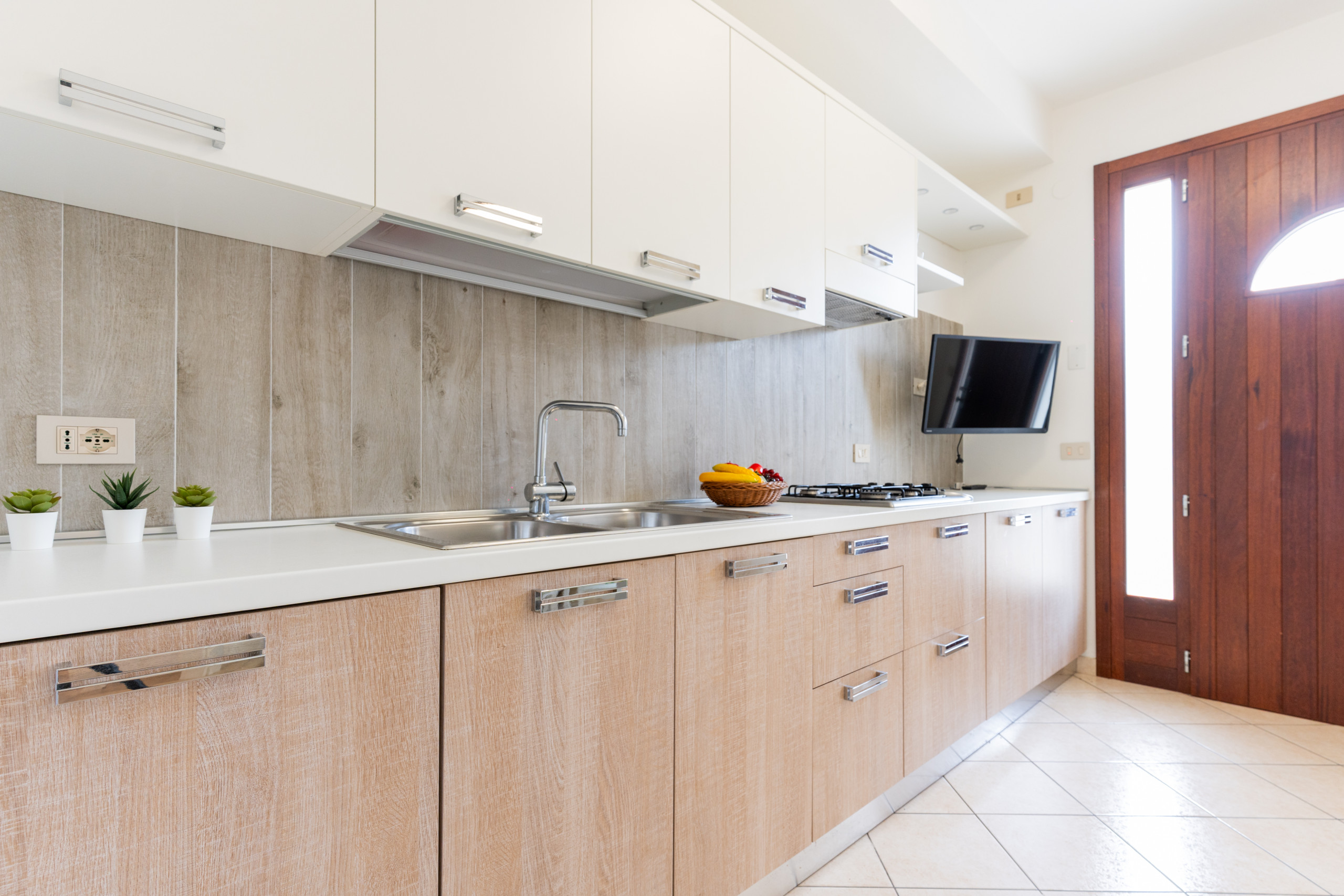 Inside, the three-room apartments of about 50 sqm consist of a master bedroom, a double bedroom and a living room with an equipped kitchenette and a double sofa bed. The bathroom is modern and equipped with a shower cubicle.