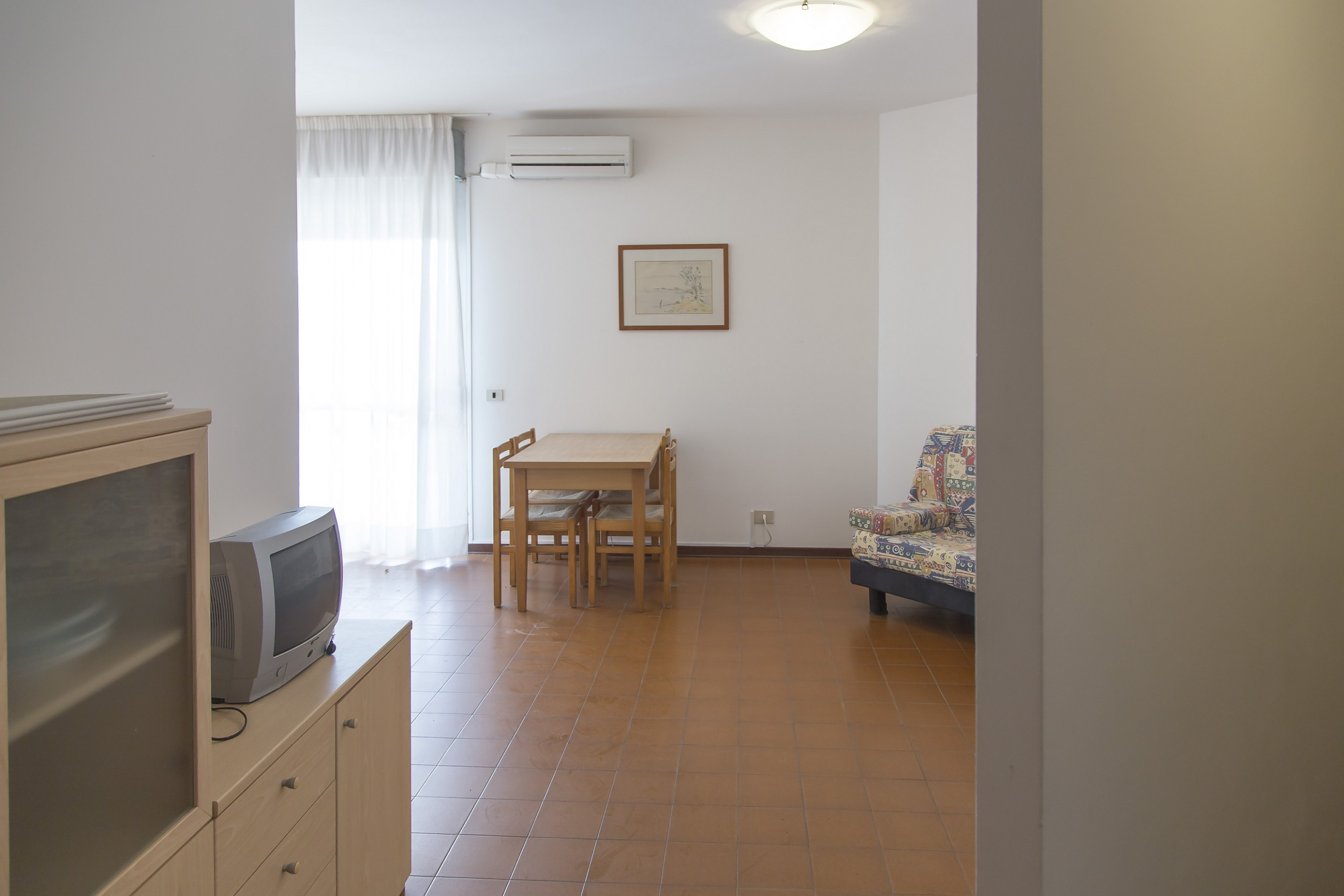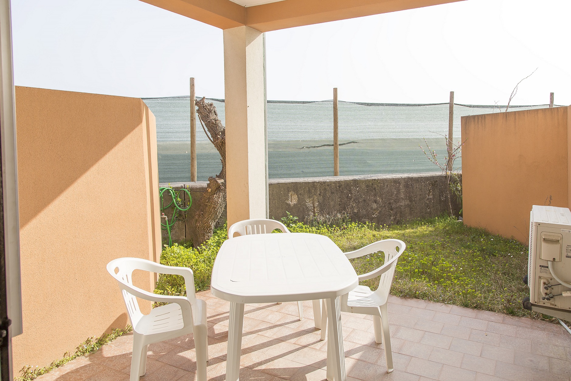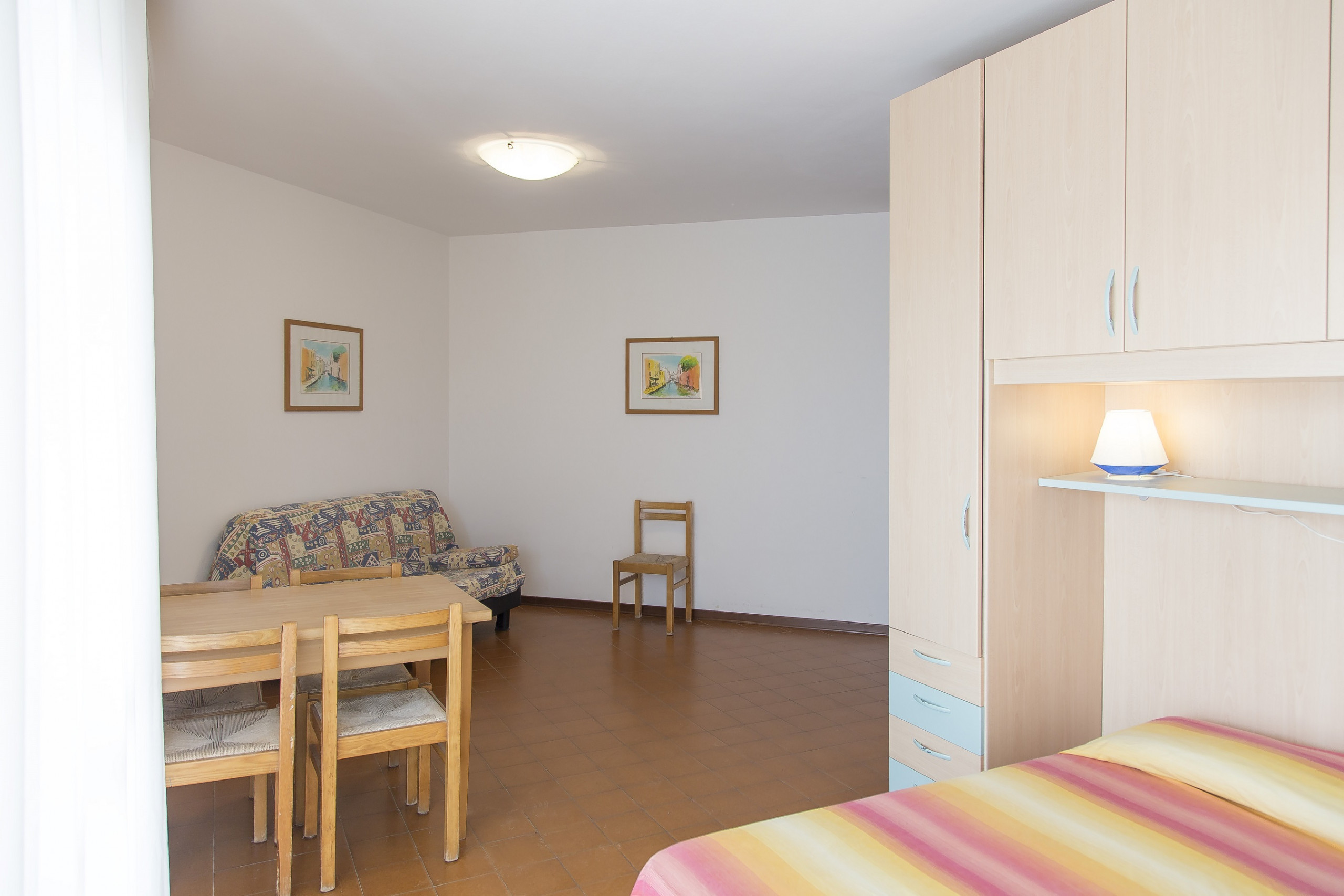 1 room flat with 2 beds and a double sofa bed. 1 room flat on the ground floor in the part "C" of the residence with terrace and a minigarden directy to the sea (new electric awning). Living/sleeping room with a doublebed and double sofa bed, TV and kitchen corner, one bathroom. "Garuda C" is a Residence directly on the sea front with swimming pool in Ca' di Valle (Cavallino). It offers apartments of different types with TV, the most also with air cond. Compulsory beachplace on surcharge is compulsory and not included in the price. One reserved parking space for each apartment on the fenced parking.
