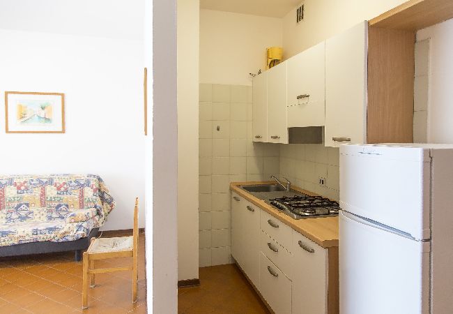 3 room flat with 4 beds. Flat on second floor (without Lift), with 1 double bedroom + singlebed, 1 bedroom with bunkbed, kitchen/dining room, no sofa, bathroom, small terrace. "Casa Giannina A" is a small fenced building on the sea side only 40 meters from the beach in the center of Lido di Jesolo between Piazza Mazzini and Piazza Brescia. Offers flats of different types all with TV and air conditioned, some also with balcony. Compulsory beachplace on surcharge, not included in the price. Fenced and numbered parking place for one car/each apartment.