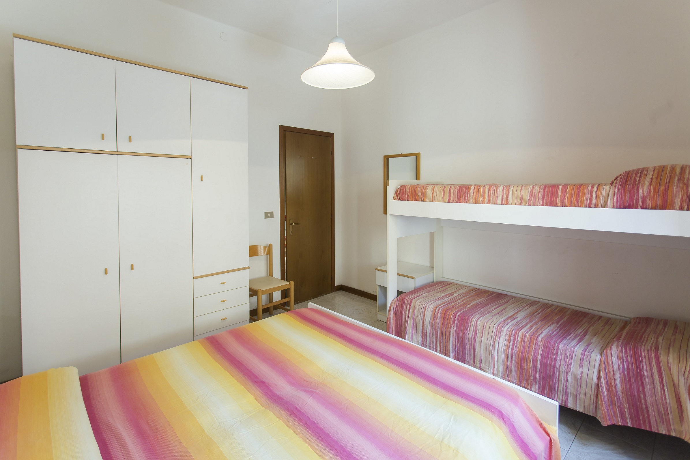 Flat on the first floor, with 1 doubleroom plus bunkbed, 1 doubleroom, double sofabed in the living-dining room with kitchen corner, bathroom and terrace. "Villa Generosa" is a small fenced indipendent villa only 30 meters from the beach in Lido di Jesolo, in a quiet position near Piazza Marconi/ Piazza Manzoni. Villa Generosa consists of 2 flats, one on the ground floor, one on the first floor, each one with tv, washing machine, air conditioned and terrace. Beach is compulsory and on surcharge, not included in the price. Fenced parkingplace by the house for one car/each apartment.