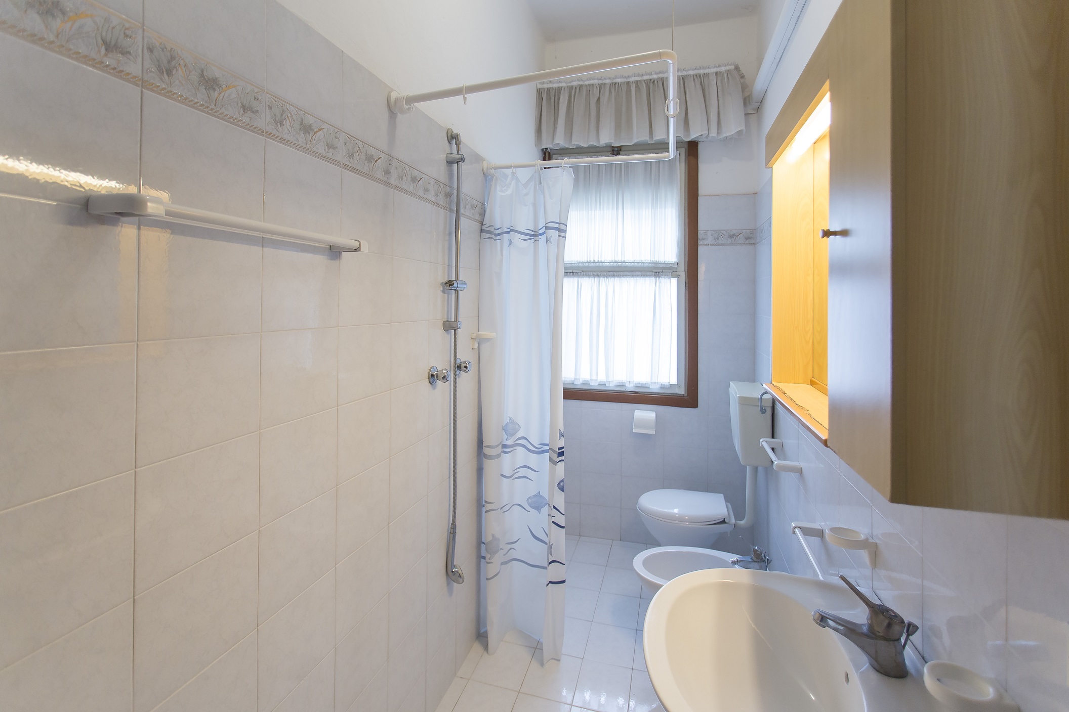 Flat on the ground floor, with one double room plus single bed, double room with 2 single beds, double divanbed in the living-dining room with kitchen corner, bathroom. New village of 60 units, at about 530 meters from the central Piazza Mazzini at Lido di Jesolo. Beach service NOT available. Pool (for adults and children) equipped with sunroof, sun loungers and umbrellas. Different types of flats, equipped with washing machine, dishwasher, microwave, refrigerator-column, air co., hairdryer, satellite SAT LED TV, WI-FI, 1 outdoor parking-place for each apartment included in the price. On request toll parking in the garage. Caretaker available in the village.
