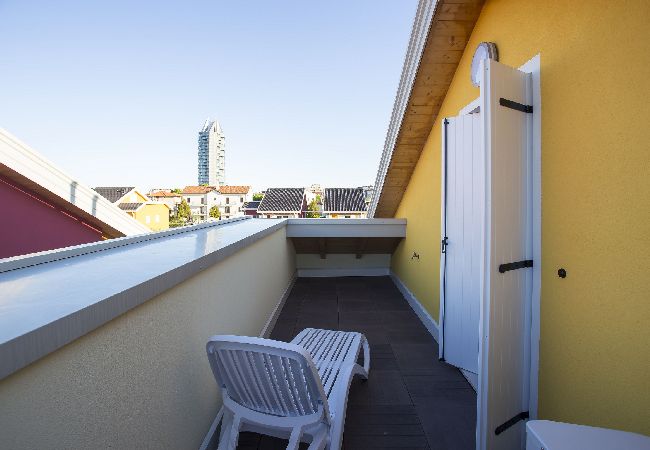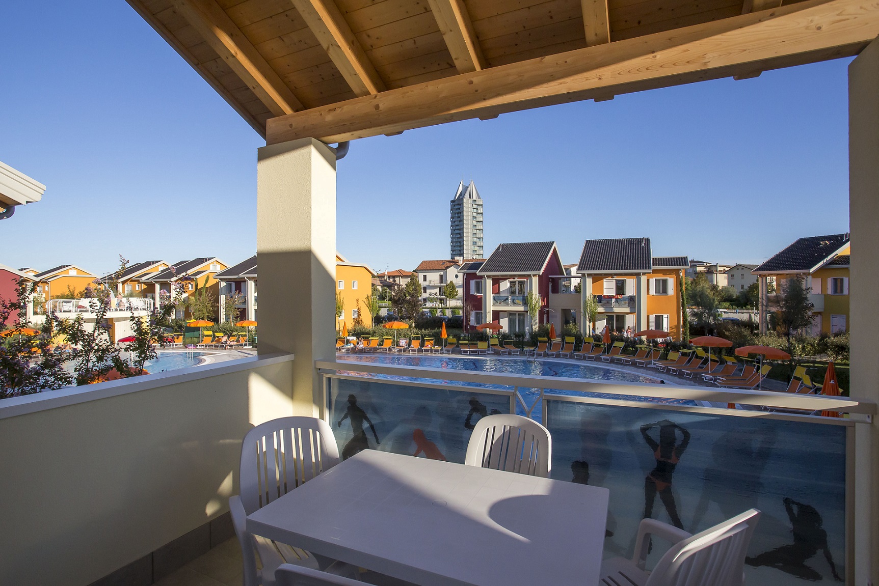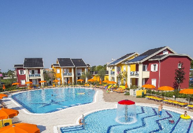 Flat on the first floor, with double room plus extra bed, double sofa bed in the living-dining room with kitchen corner, bathroom; double sofa bed and another bathroom in the mandsard. New village of 60 units, at about 530 meters from the central Piazza Mazzini at Lido di Jesolo. Beach service NOT available. Pool (for adults and children) equipped with sunroof, sun loungers and umbrellas. Different types of flats, equipped with washing machine, dishwasher, microwave, refrigerator-column, air co., hairdryer, satellite SAT LED TV, WI-FI, 1 outside parkingplace for each apartment included in the price. On request toll parking in the garage. Caretaker available in the village.