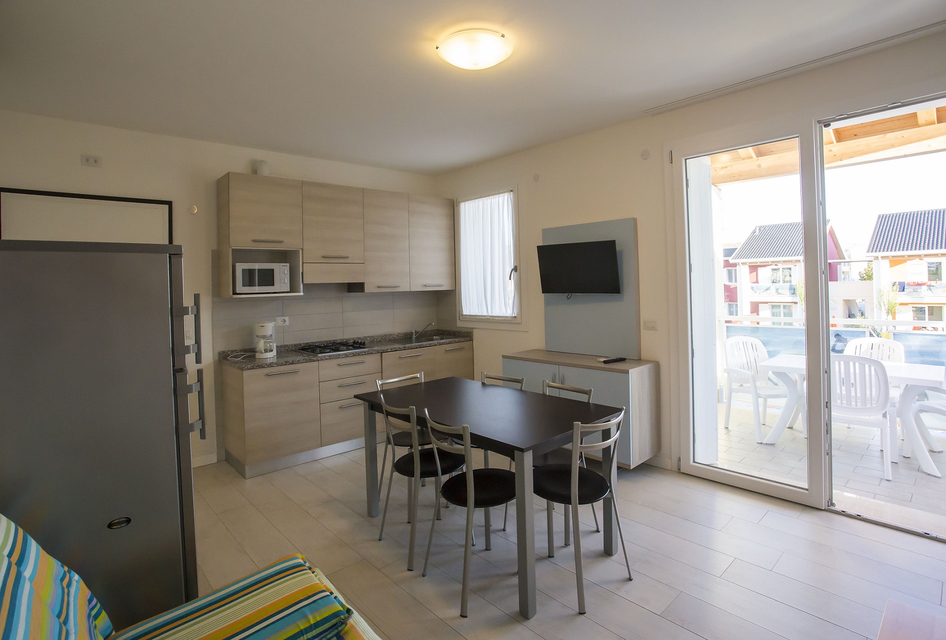 Flat on the ground floor, with one double room plus single bed, double room with 2 single beds, double divanbed in the living-dining room with kitchen corner, bathroom. New village of 60 units, at about 530 meters from the central Piazza Mazzini at Lido di Jesolo. Beach service NOT available. Pool (for adults and children) equipped with sunroof, sun loungers and umbrellas. Different types of flats, equipped with washing machine, dishwasher, microwave, refrigerator-column, air co., hairdryer, satellite SAT LED TV, WI-FI, 1 outdoor parking-place for each apartment included in the price. On request toll parking in the garage. Caretaker available in the village.
