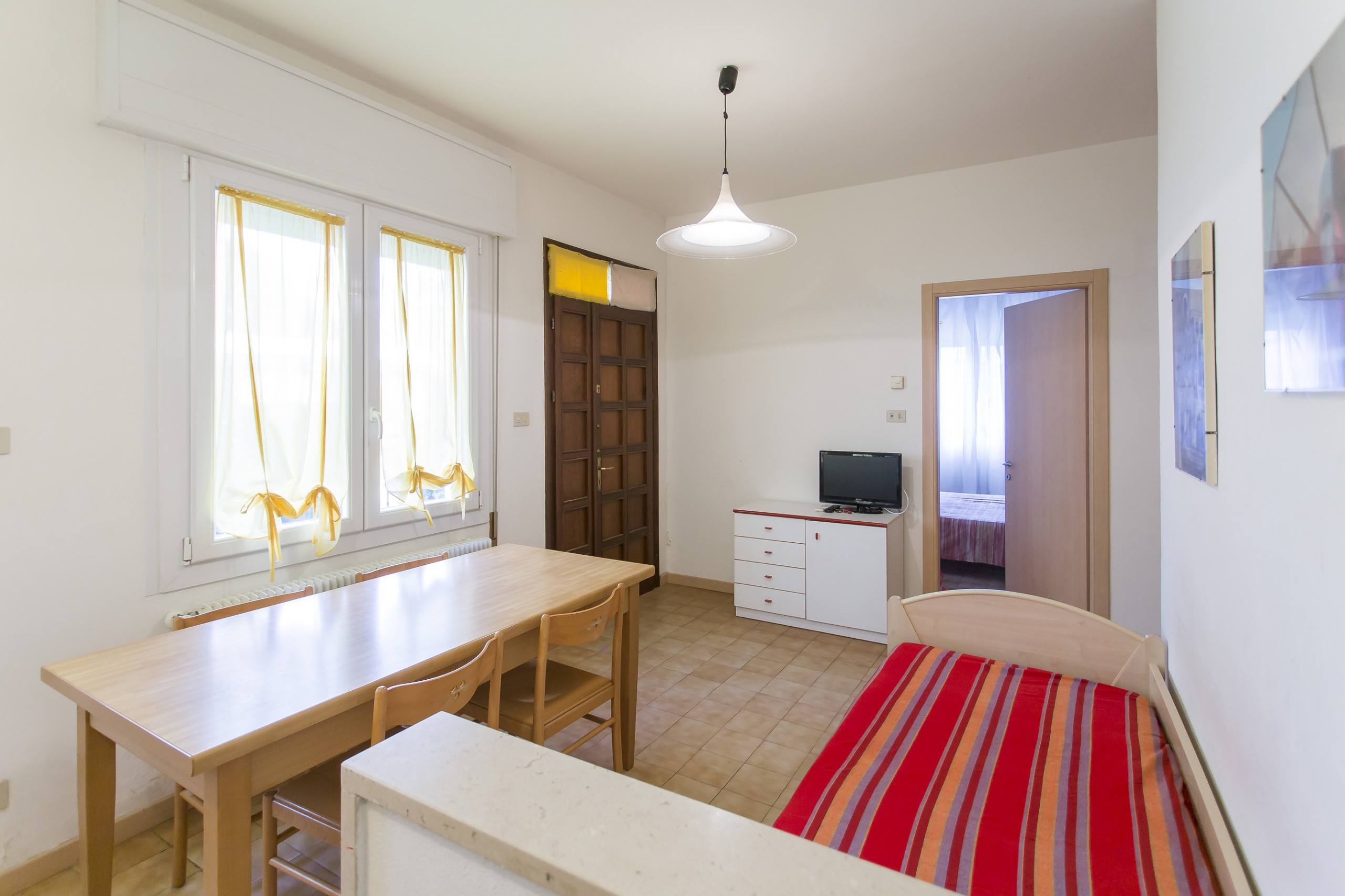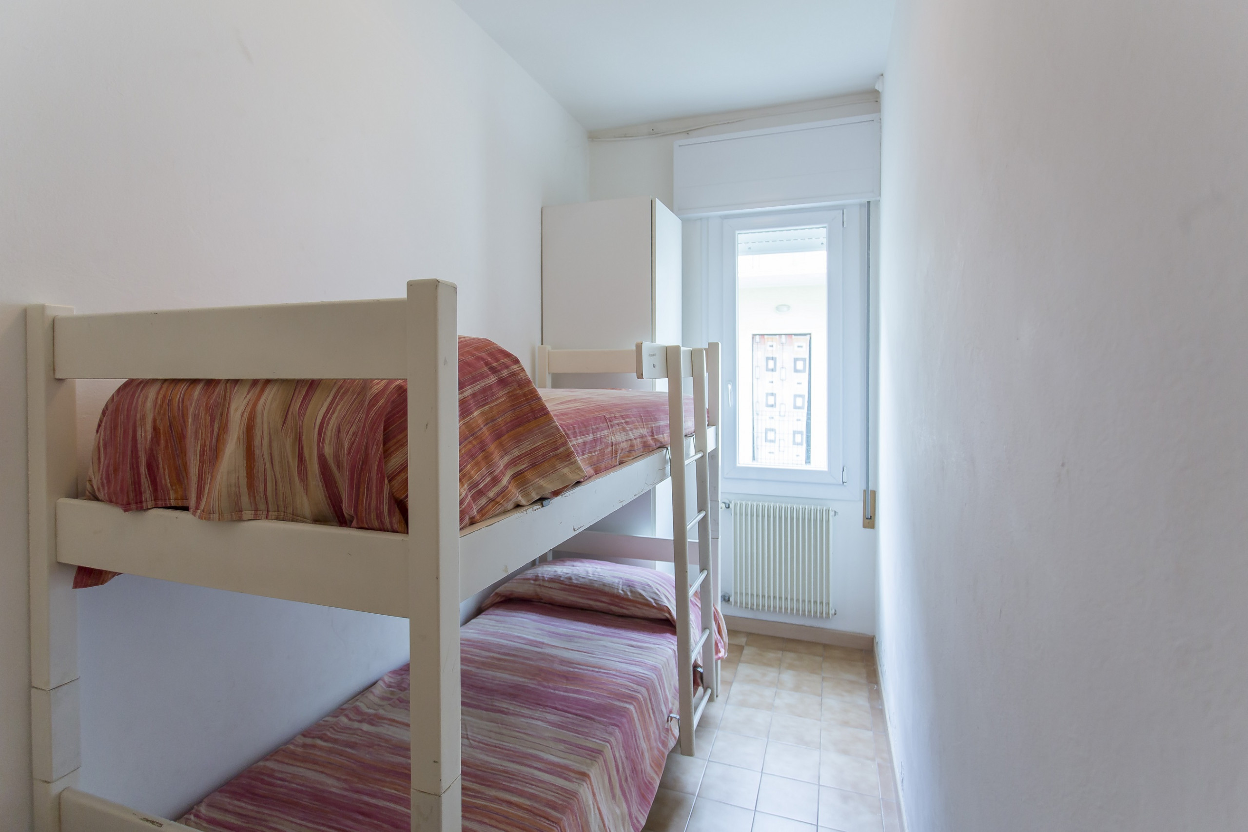 3 room flat with 6 beds and a double sofa bed. 3-room flat on the second floor without balcony. Offers 1 double bedroom + bunkbed, 1 double bedroom, dining/living room with 1 double-sofa-bed, kitchen corner. 1 bathroom. The house "Zenith" is an indipendent villa situated 10 meters from the beach of Lido di Jesolo, central but also quiet near Piazza Trieste surrounded by restaurants, bars and shops. Small private beach in front of the house. The villa consists of eight flats over 3 floors (no lift) some of them with large balconies to the seaside. All of them with tv, washing machine and air cond. Flats with three bedrooms could also have two bathrooms. Compulsory beach service is on surcharge and not included in the price. Reserved parking place by the house.