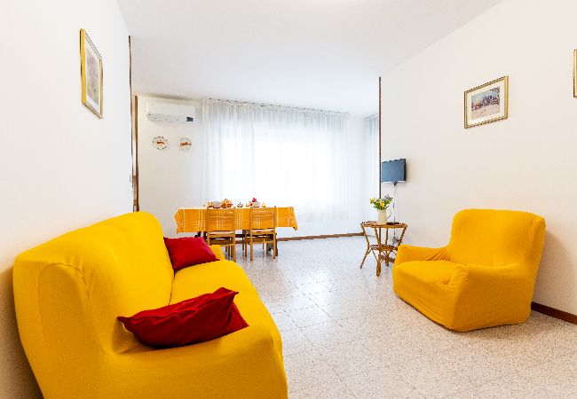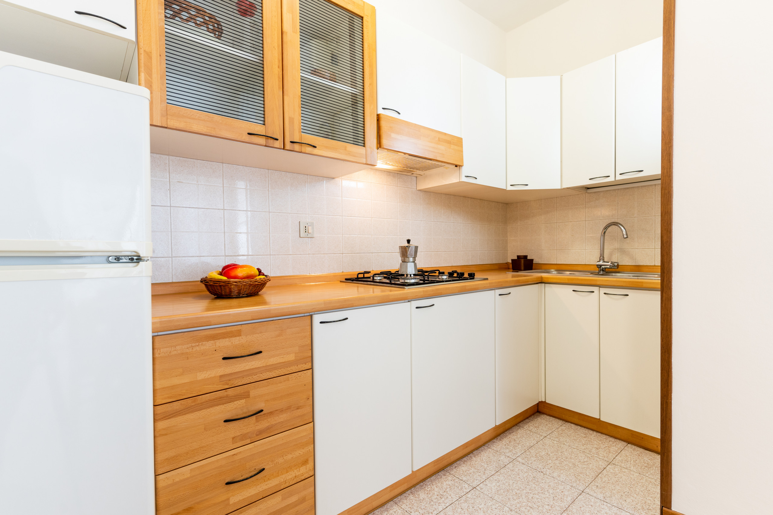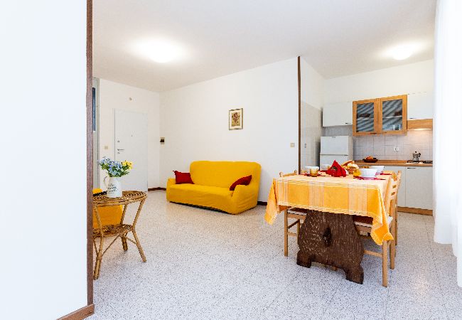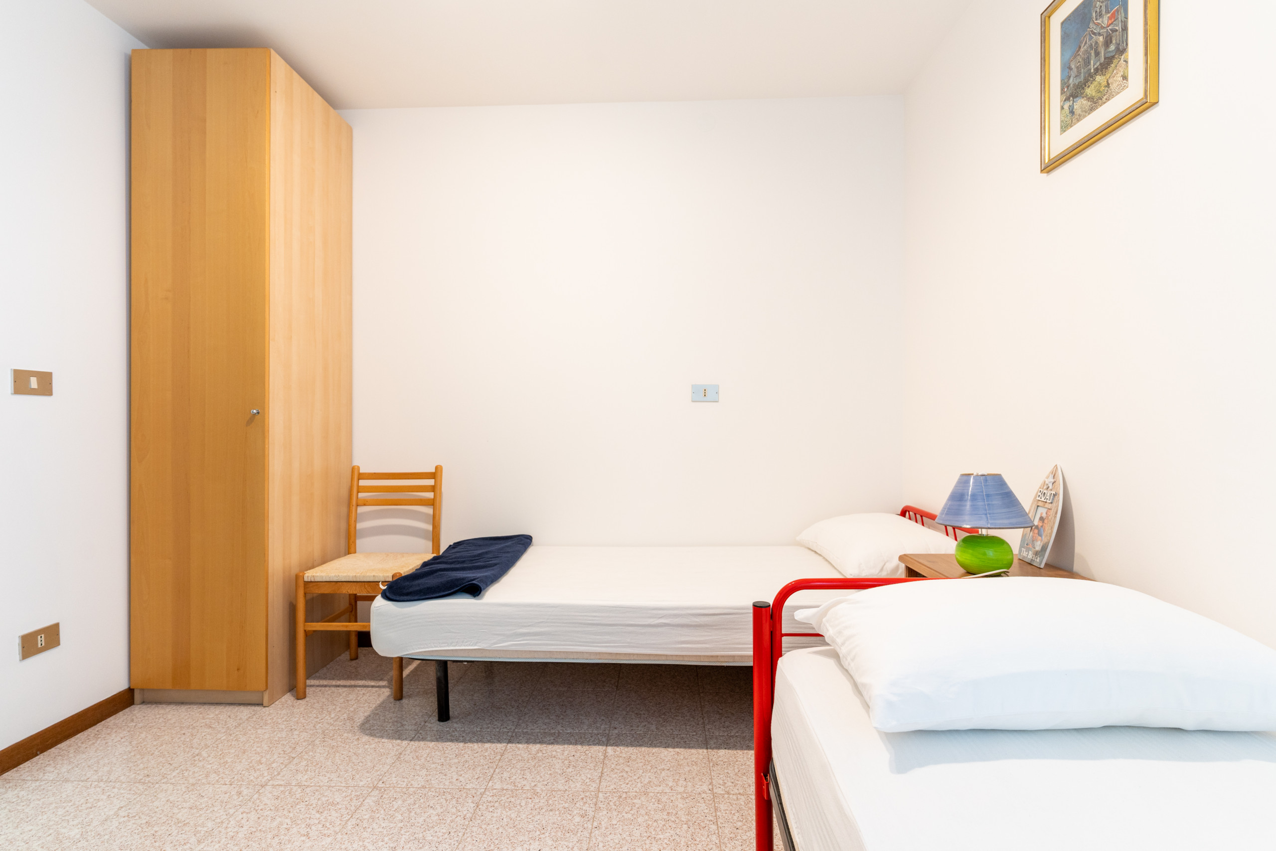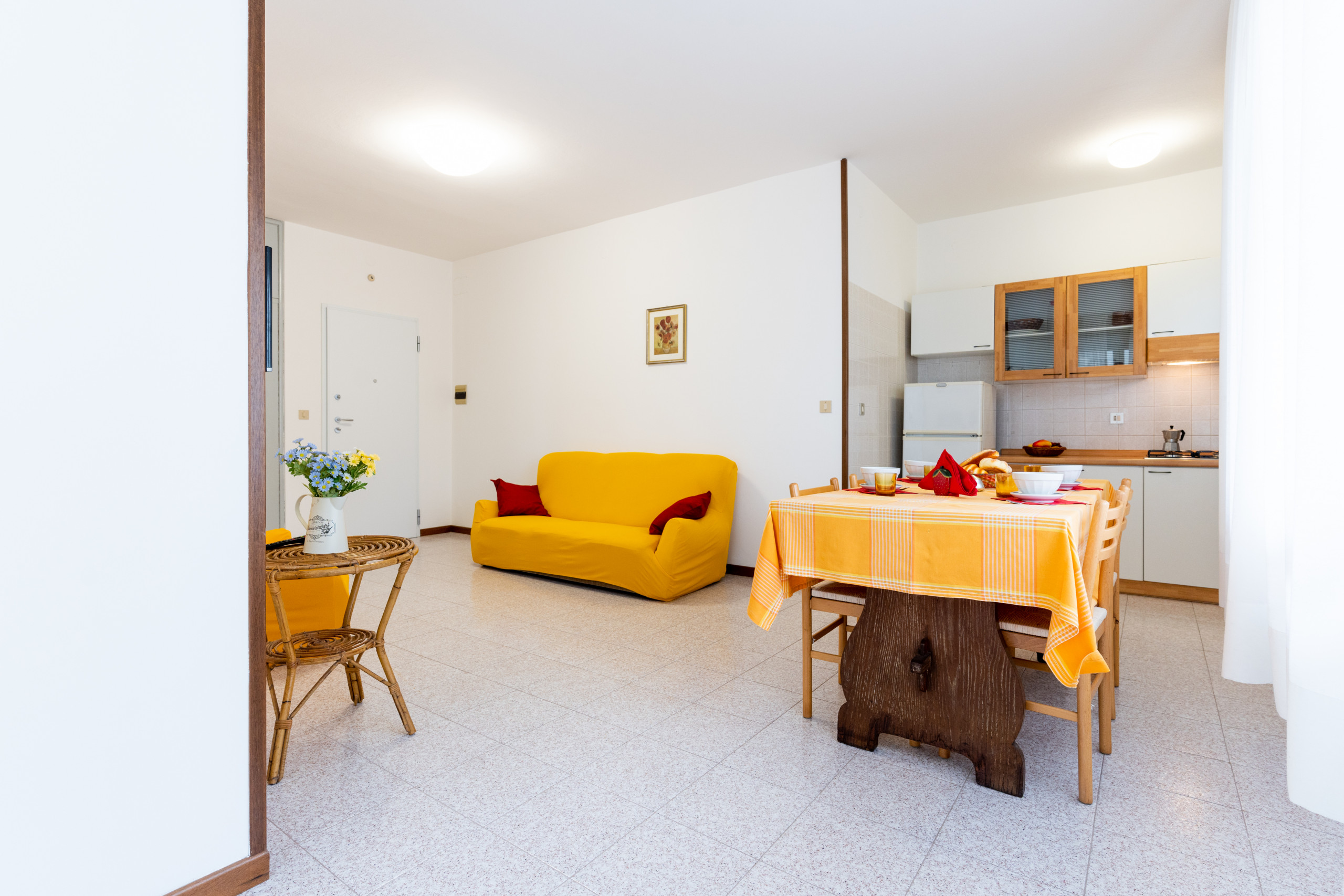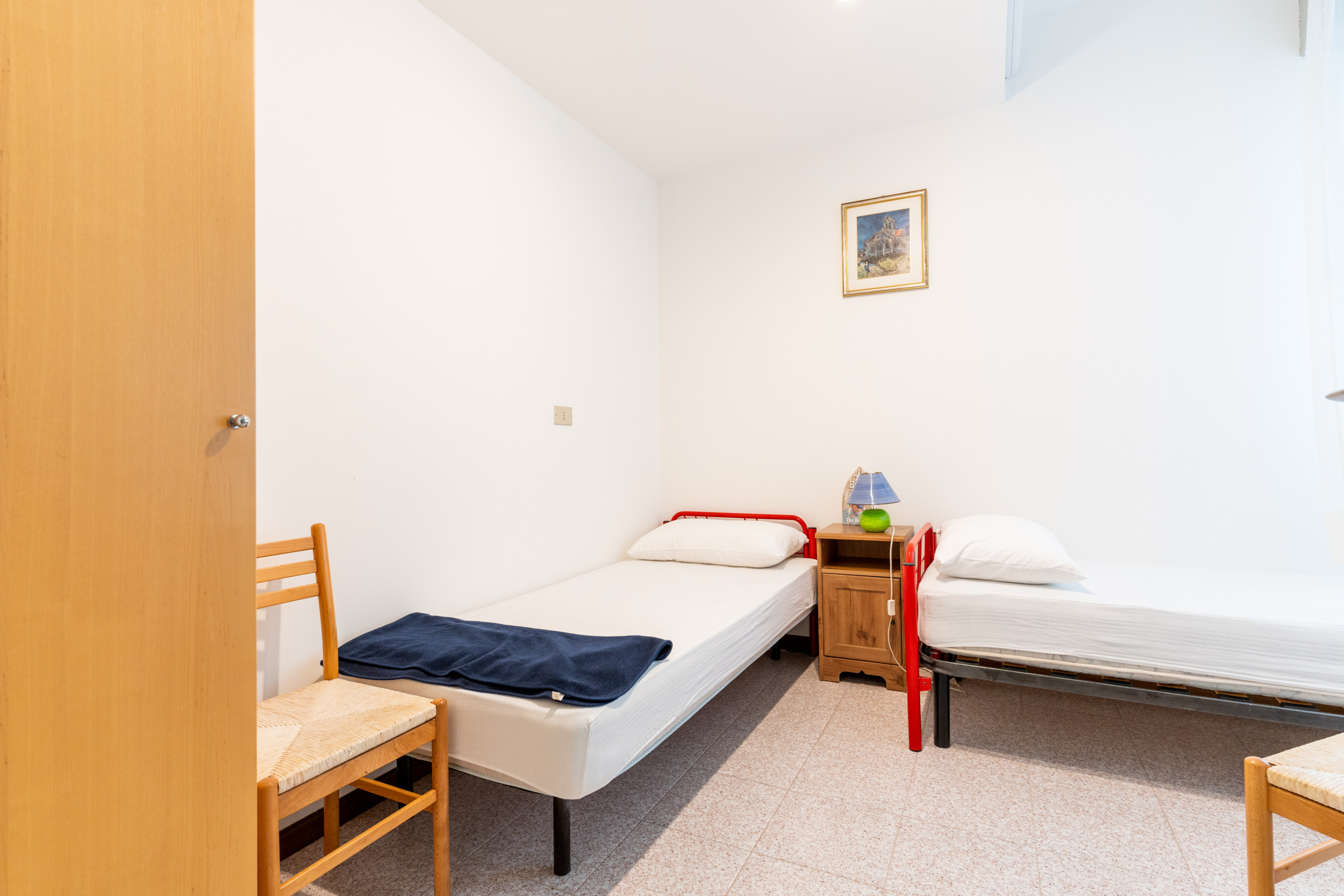 3 room flat with 4 beds. Flat on second floor (without Lift), with 1 double bedroom + singlebed, 1 bedroom with bunkbed, kitchen/dining room, no sofa, bathroom, small terrace. "Casa Giannina A" is a small fenced building on the sea side only 40 meters from the beach in the center of Lido di Jesolo between Piazza Mazzini and Piazza Brescia. Offers flats of different types all with TV and air conditioned, some also with balcony. Compulsory beachplace on surcharge, not included in the price. Fenced and numbered parking place for one car/each apartment.