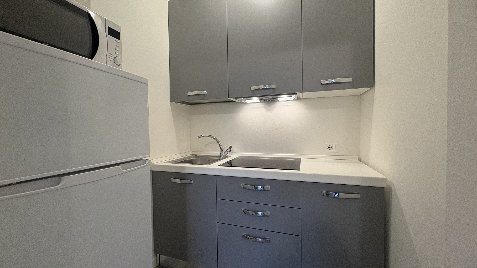 - A living room with an induction kitchenette equipped with microwave, table, chairs, and a double sofa bed.
