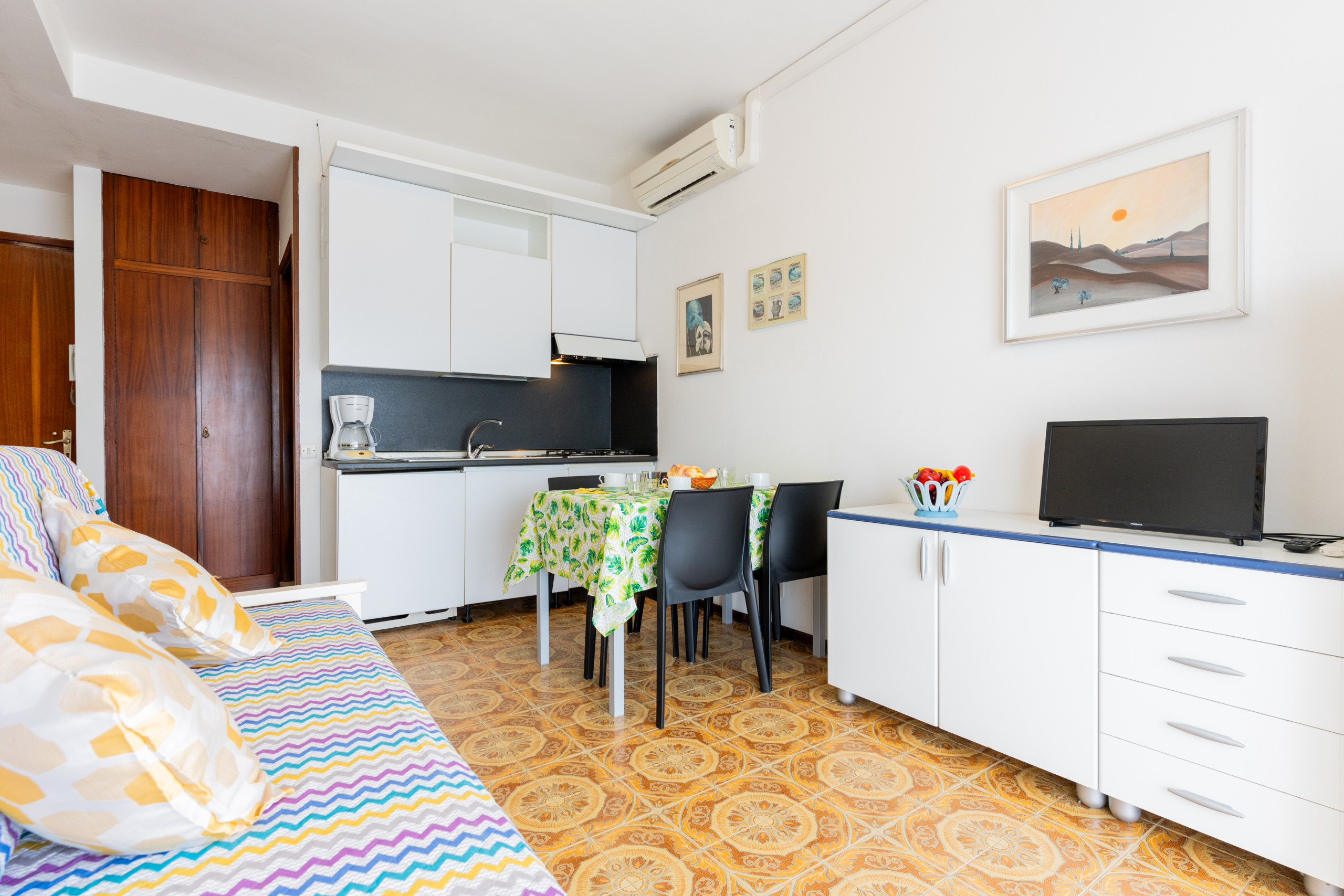 - A living room with an equipped kitchenette, table, chairs and a double sofa bed.