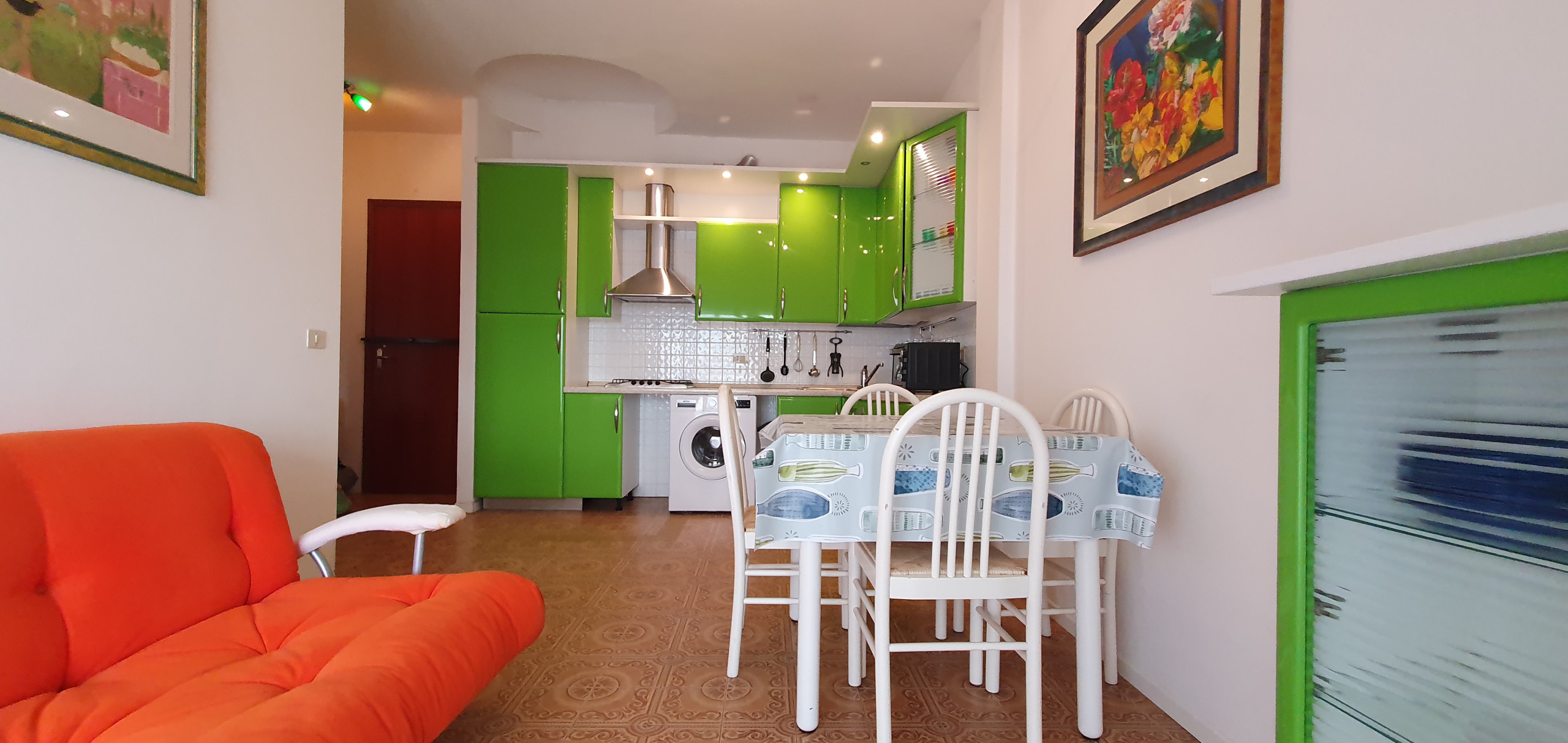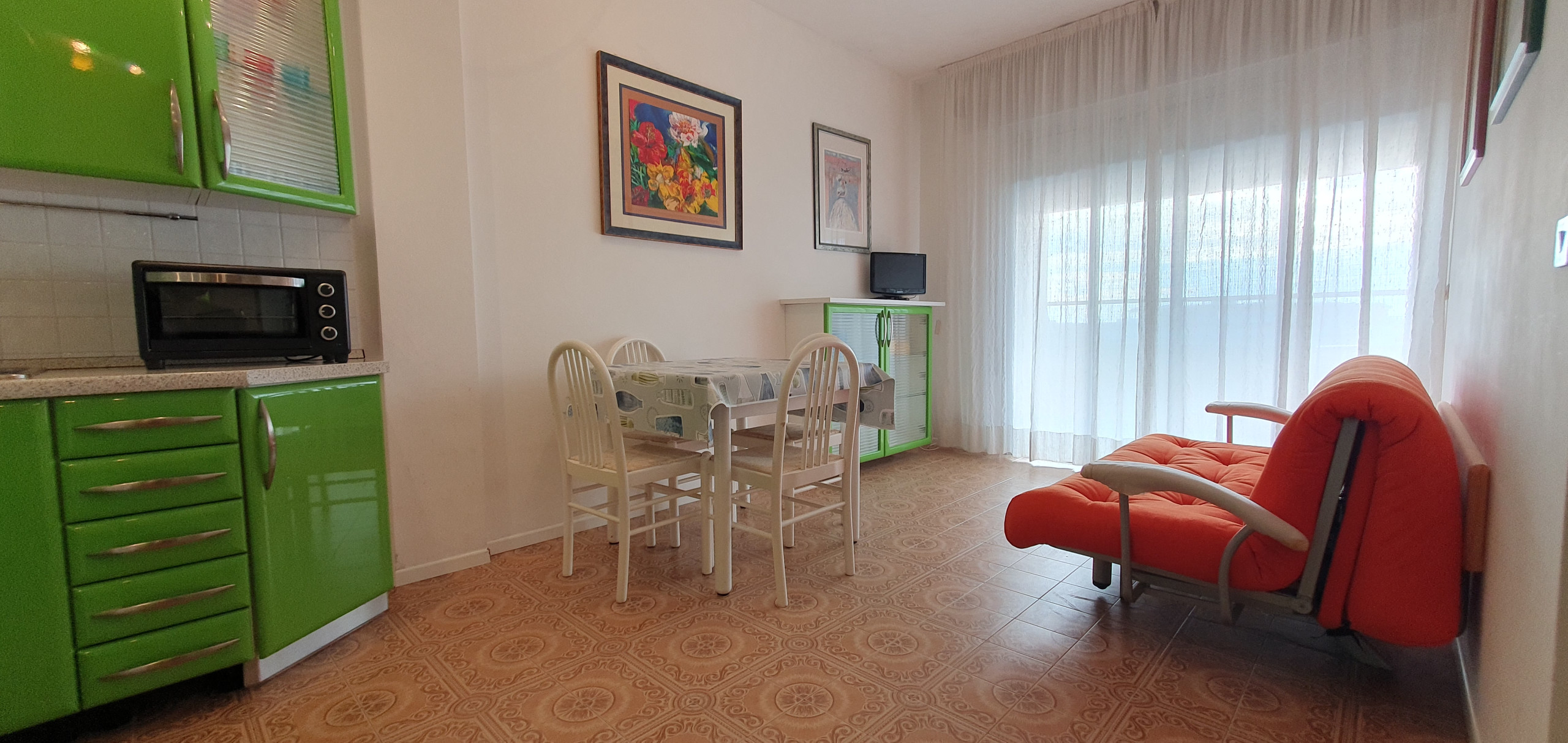 - A living room with an equipped kitchenette, with microwave, dishwasher, table, chairs and double sofa bed.