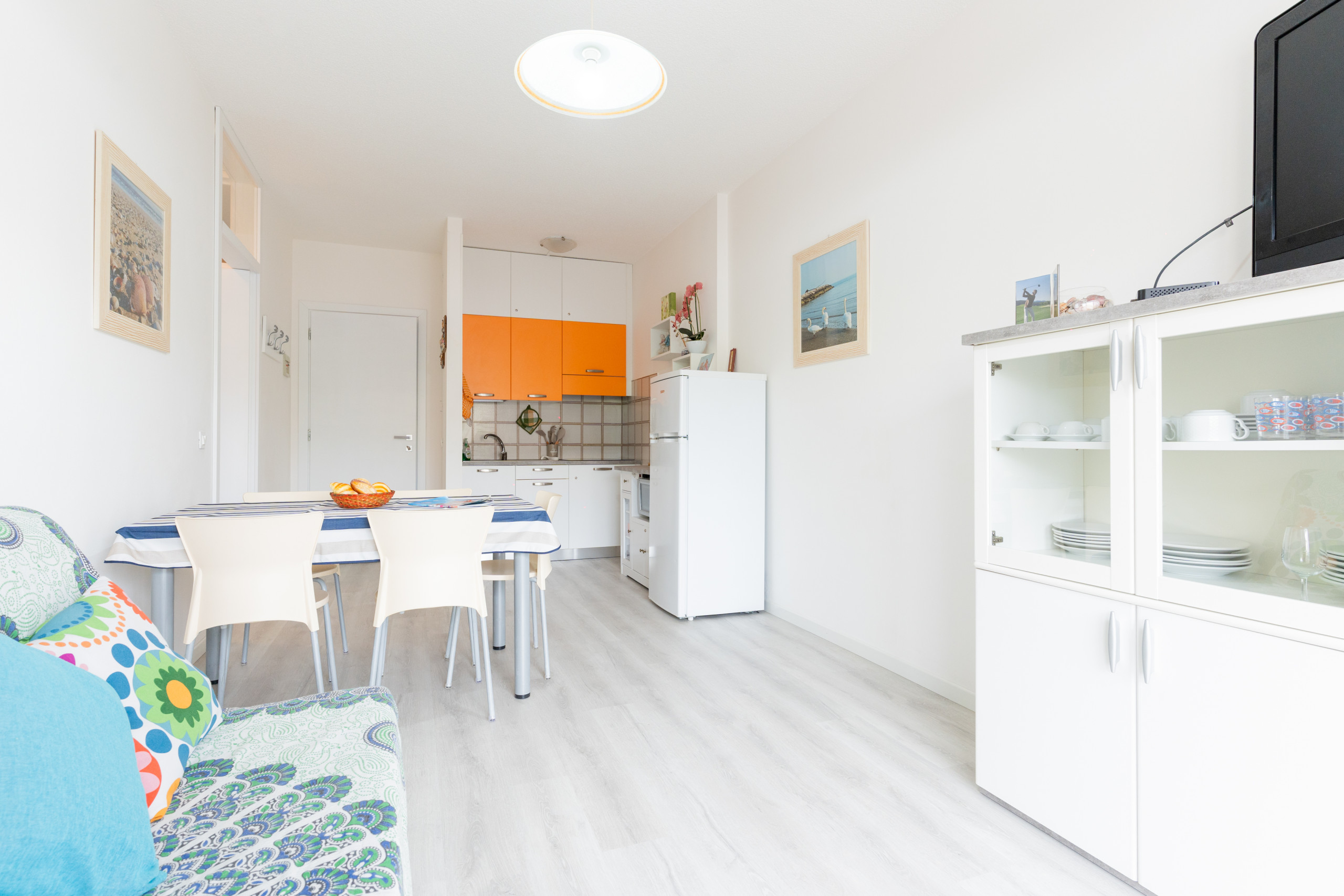 - A living room with an equipped kitchenette, table, chairs and a double sofa bed.