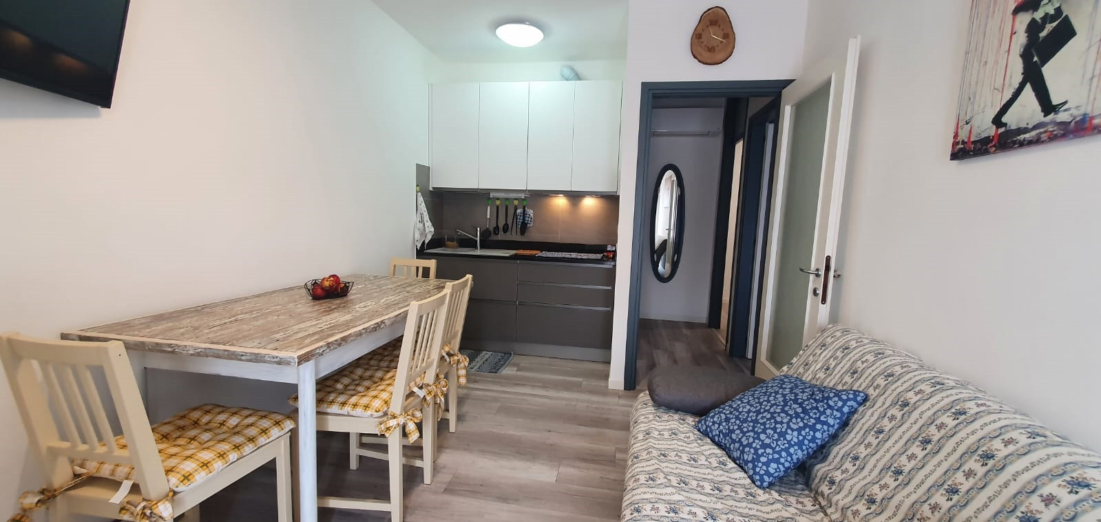 - a living room with an equipped kitchenette, table, chairs and a double sofa bed.
