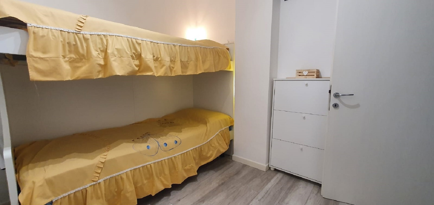 - two bedrooms, one with a bunk bed and the other with a double bed and a single bed;