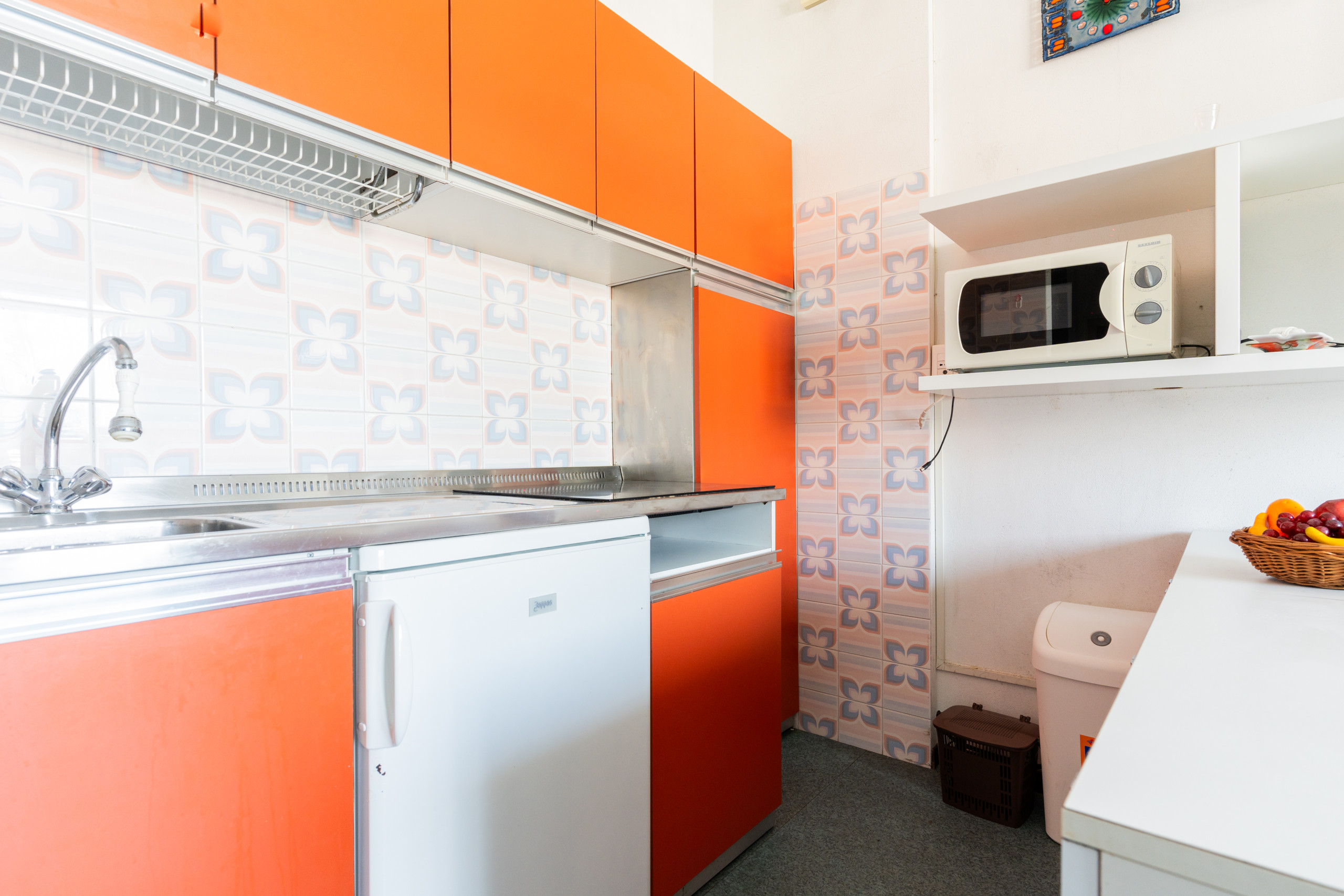 - A living room with an equipped kitchenette, with microwave, dishwasher, table, chairs and double sofa bed.