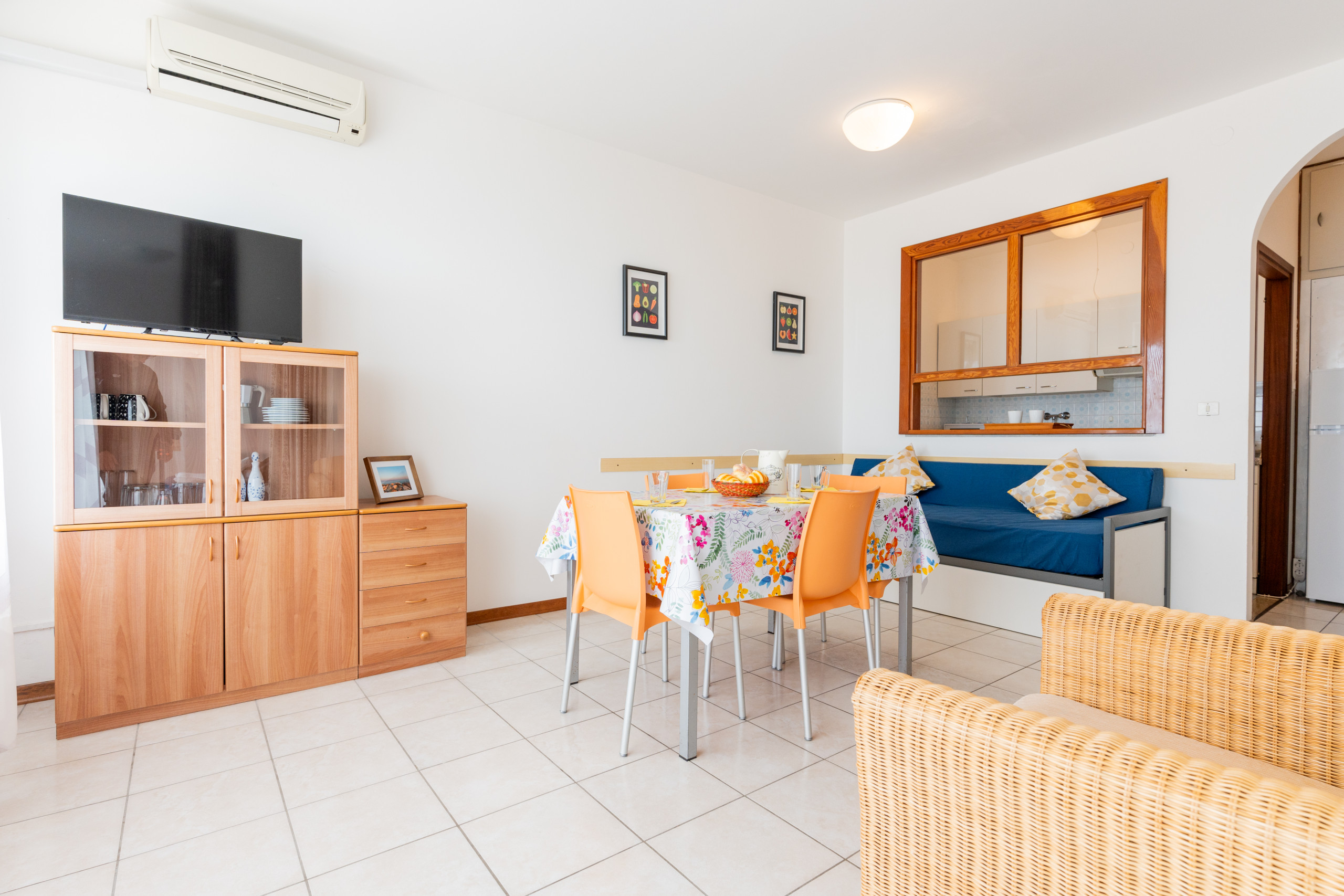 - A living room with an equipped kitchenette, with microwave, dishwasher, table, chairs and double sofa bed.