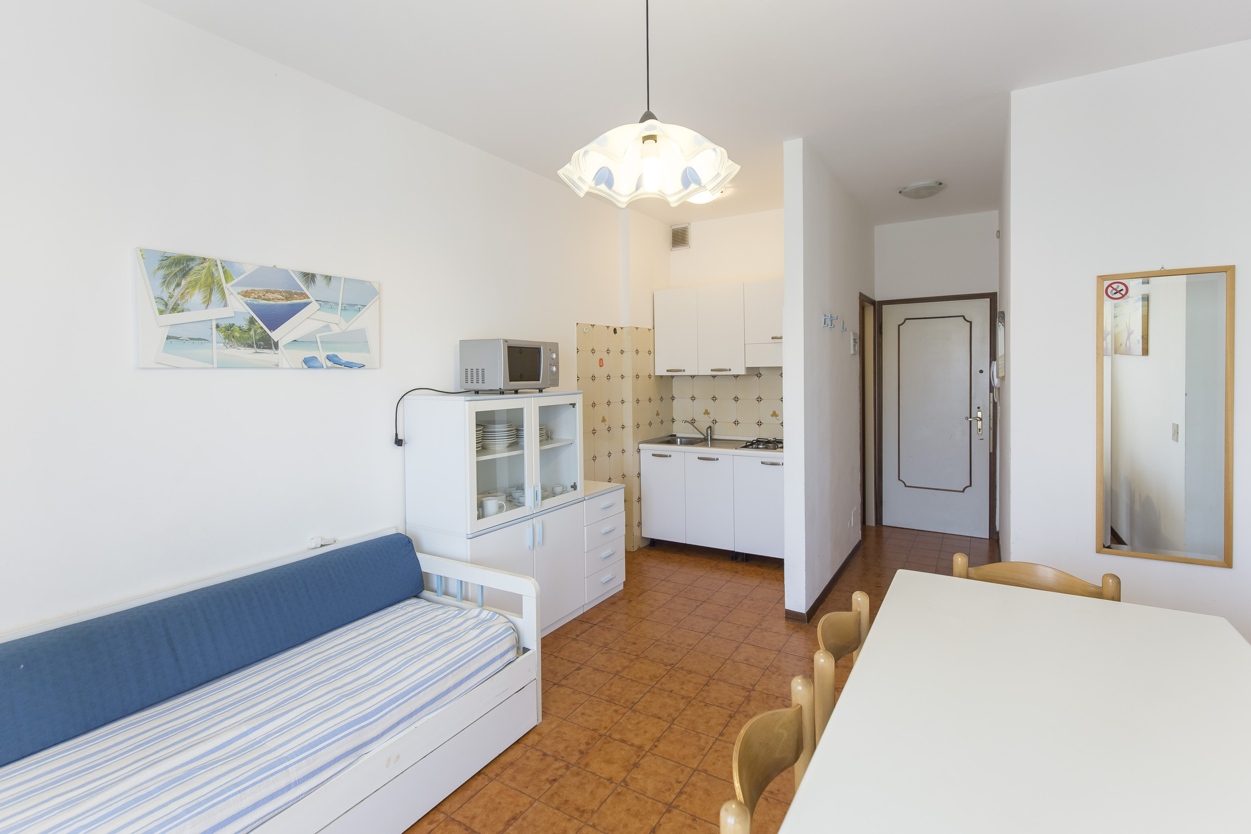 - A living room with an equipped kitchenette, table, chairs and a double sofa bed.