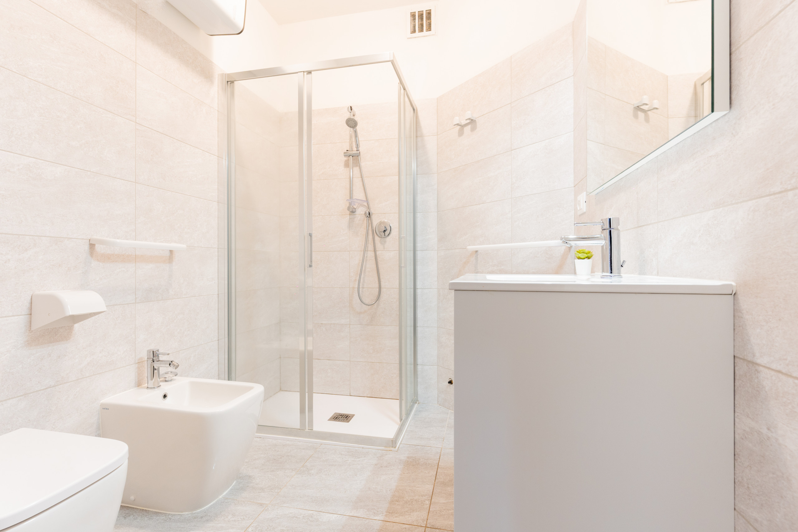 - A bathroom with shower box, washing machine