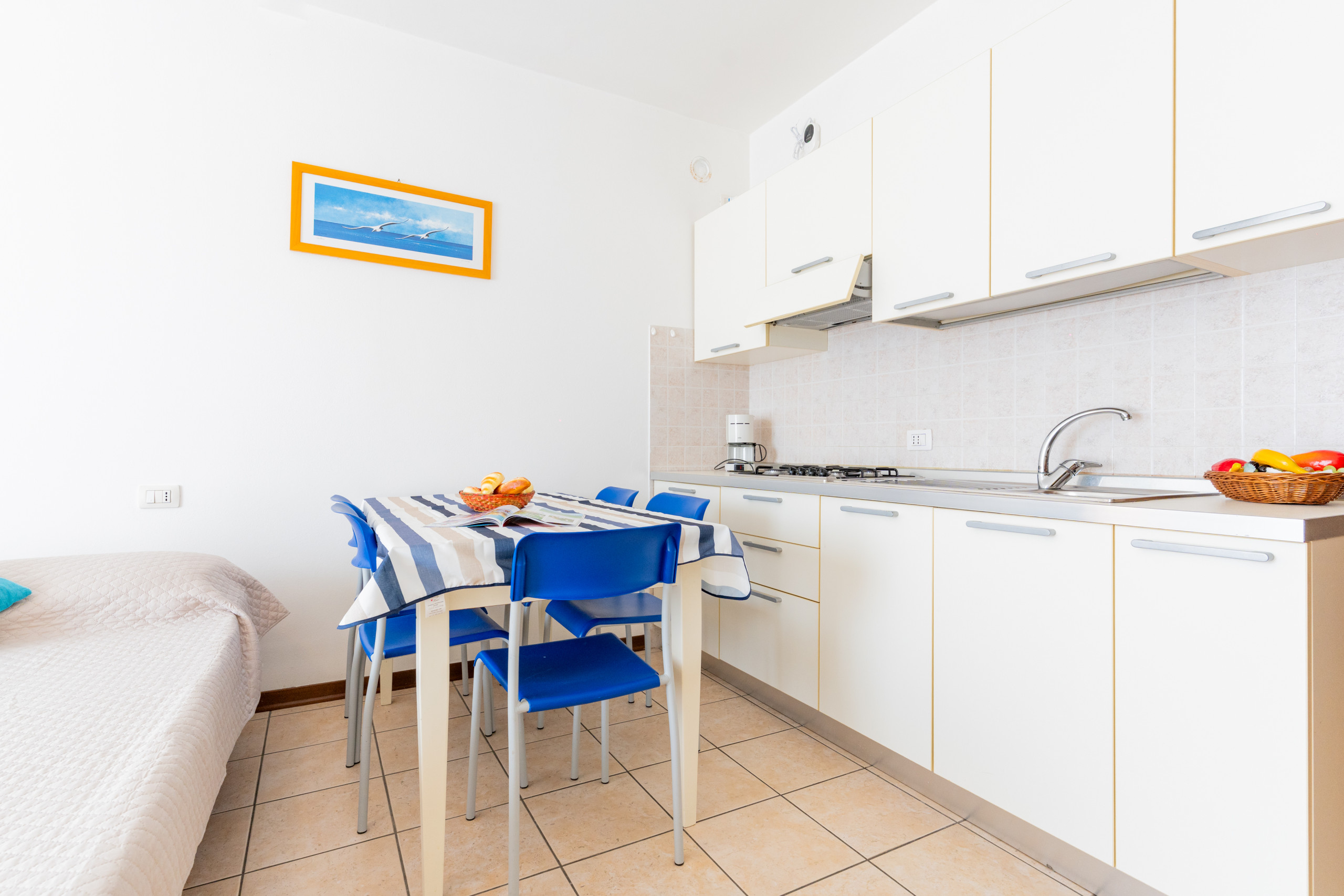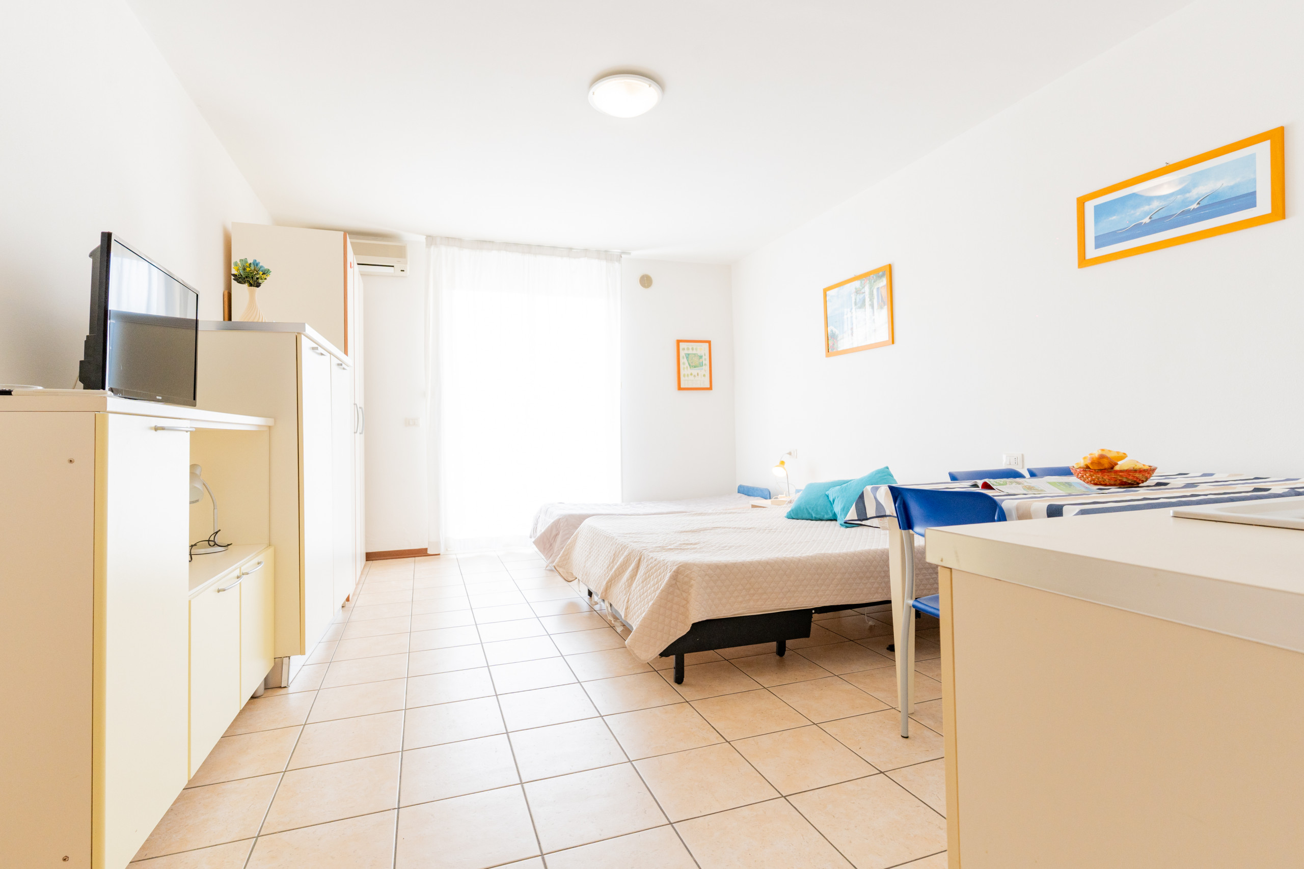 The accommodation has air conditioning to ensure maximum comfort during the summer months, and can comfortably accommodate up to 3 people. The apartment includes a double bed and a single bed, ideal for small groups or families.